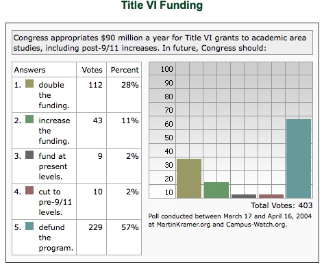 Above are the results of the month-long Title VI poll, conducted at this website and at Campus-Watch.org. And here are the usual caveats: it’s not scientific, it’s only the opinions of people who visit these websites, people might have voted twice (though they couldn’t from the same IP address), etc. Now, having said all that, let’s jump to some conclusions.