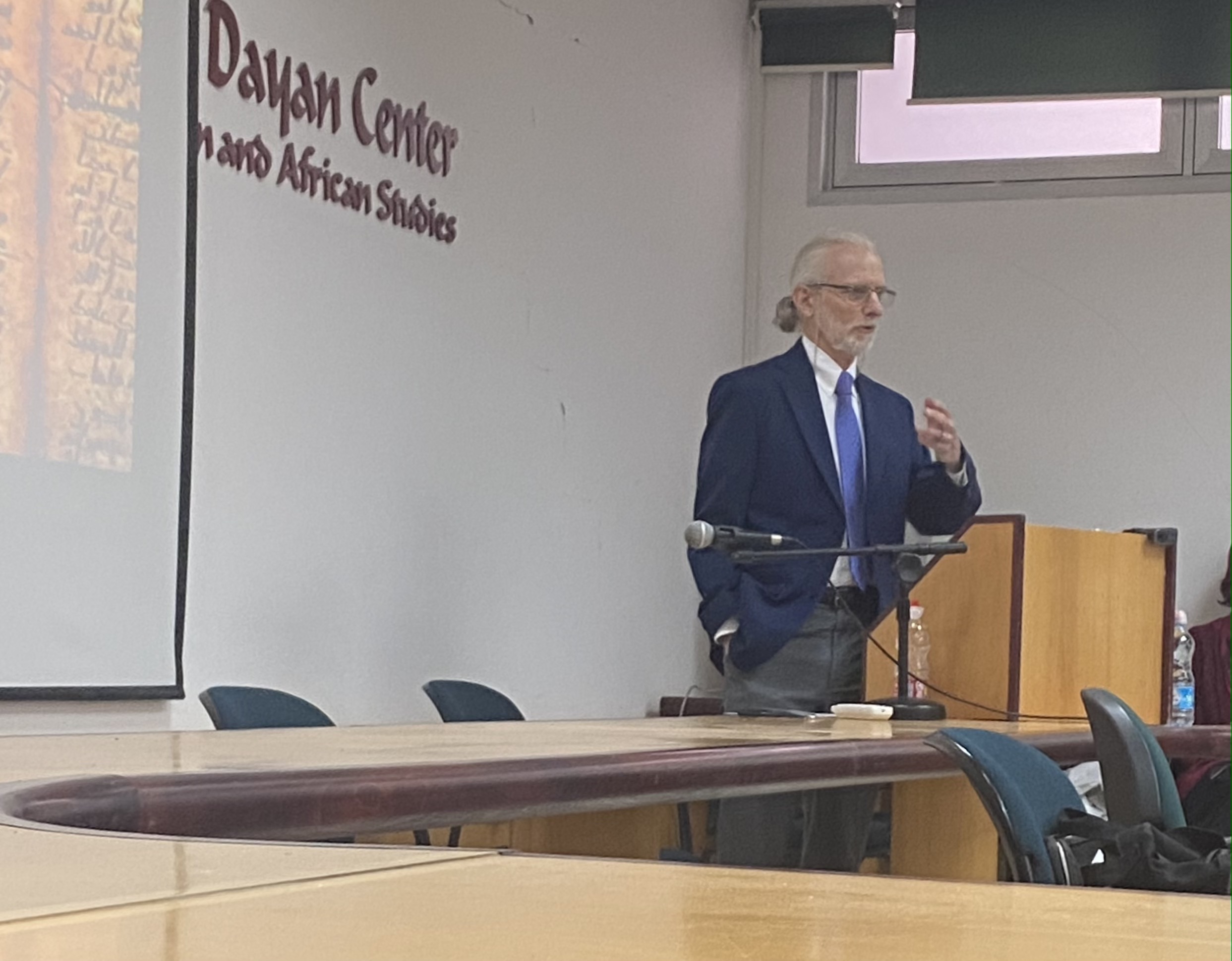 Below: Fred Donner delivers his lecture (my photograph). The sponsoring host was the Zvi Yavetz School of Historical Studies, Professor Miri Shefer-Mossensohn in the chair; the venue, the seminar room of the Moshe Dayan Center for Middle Eastern and African Studies.