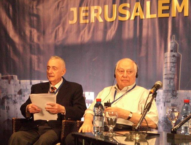 Uri Lubrani (left) and Bernard Lewis at a conference in Jerusalem.