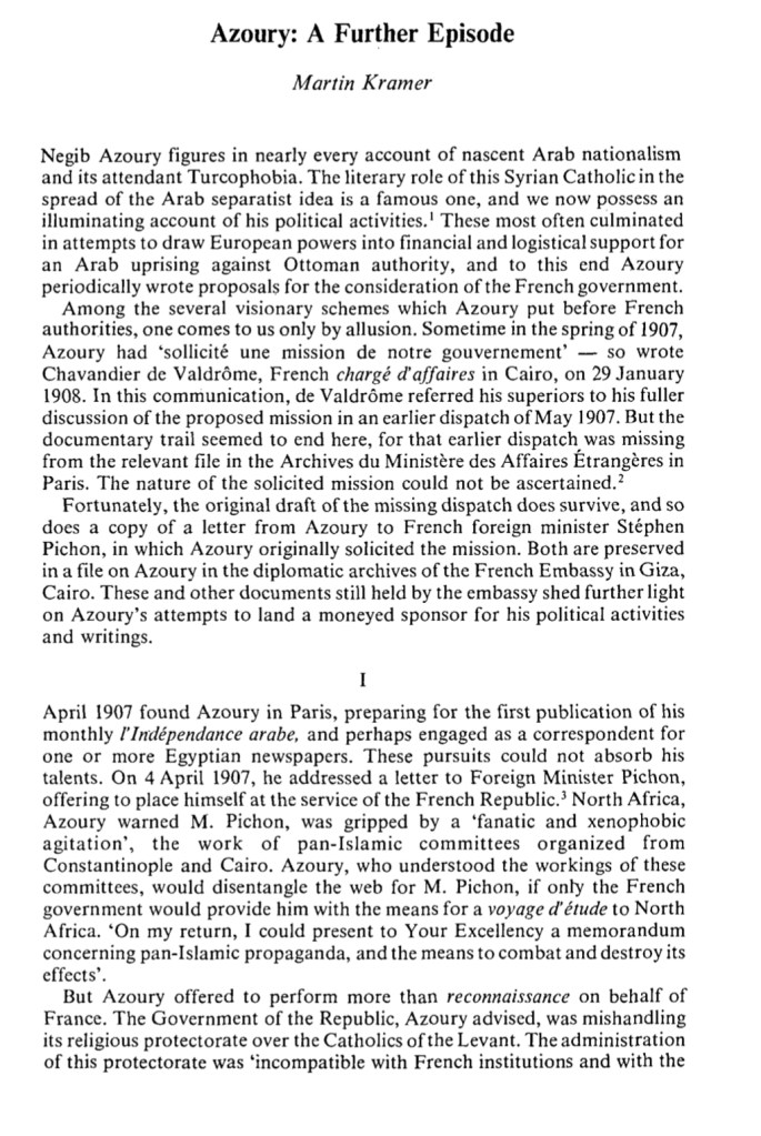 Azoury: A Further Episode Martin Kramer, “Azoury: A Further Episode,” Middle Eastern Studies (London), vol.18, no. 4 (October 1982), pp. 351-58. Read more:Download Share this: Click to share on Facebook (Opens in new window) Facebook Click to share on X (Opens in new window) X Click to share on LinkedIn (Opens in new window) LinkedIn Click to share on Reddit (Opens in new window) Reddit Click to share on WhatsApp (Opens in new window) WhatsApp Click to email a link to a friend (Opens in new window) Email Click to print (Opens in new window) Print