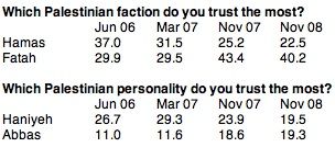 Not a shred of evidence? Here’s some evidence. Hamas sank in Palestinian public opinion in Gaza after it seized power. The most reliable Palestinian pollster got these answers from Gazans (in percentages):