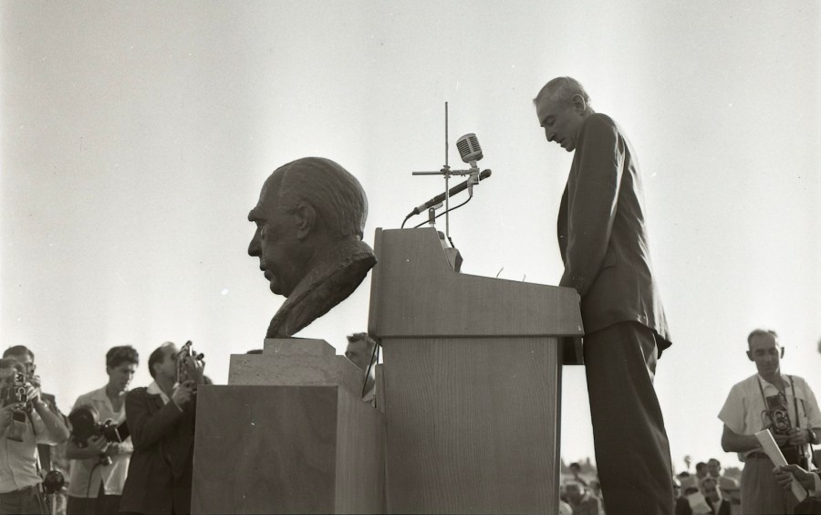 Header image: J. Robert Oppenheimer speaks at the Weizmann Institute before a bust of Niels Bohr, May 20, 1958; photograph by Boris Carmi, Meitar Collection, The Pritzker Family National Photography Collection, The National Library of Israel.