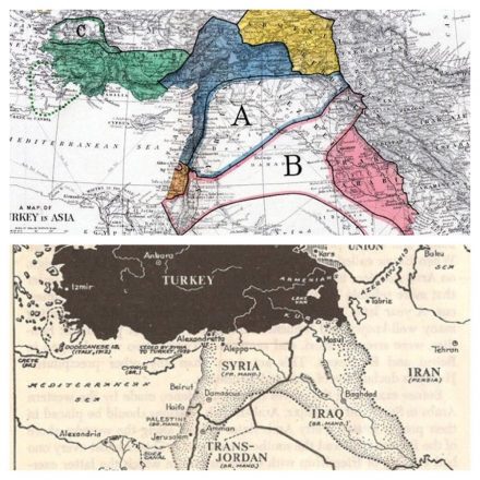 Image: the original Sykes-Picot map versus the final distribution of the mandates.